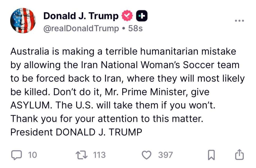 Devido a preocupações com sua segurança após protestarem contra o regime em Irã — incluindo a recusa em cantar o hino nacional em Teerã e outros atos de desafio que podem expô-las a punições ao retornarem — *o presidente Donald Trump anunciou que asilo político será concedido às jogadoras da seleção feminina de futebol do Irã caso Austrália não o faça.*A situação gerou preocupação internacional, já que algumas atletas podem enfrentar represálias severas após terem se recusado a cantar o hino nacional durante a competição, ato visto como um protesto contra o regime iraniano. Grupo de Noticias Likud Brasil: https://bit.ly/walikudbr*Faça parte do Likud Brasil e nos ajude a combater o antissemitismo.* Cadastre-se grátis:bit.ly/likudcadnever again🇧🇷https://www12.senado.leg.br/ecidadania/visualizacaoideia?id=183982&voto=favorShabat shalom/Chaverim, é da maior importância que leiamos e assinemos a proposta legislativa acima, que ainda conta com apoio restrito, mas que facilitará enormemente a vida dos Judeus no Brasil! ASSINEM! APÓIEM!!!! DIVULGUEM!!!! worldjornalistaandrehmendan.online#נדרהמנדהה #Israel #andrehmendanhanettodasilva #jornalismo #judaísmomessiâniconãoexiste