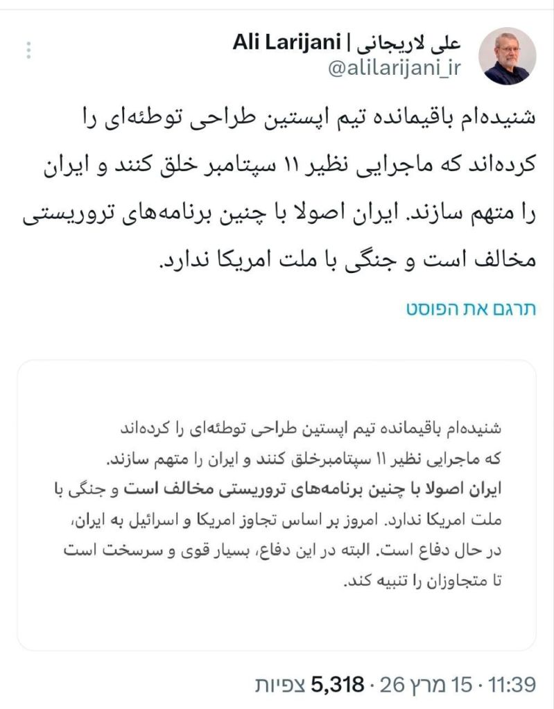 🤡🤡🤡🤡🤡*Ali Larijani, Secretário‑Geral do Conselho de Segurança Nacional do Irã:*“Ouvi que os remanescentes da equipe de Jeffrey Epstein planejaram uma conspiração para criar um evento semelhante ao de 11 de setembro e culpar o Irã por isso.O Irã é fundamentalmente contrário a tais planos terroristas e não está em guerra com o povo americano.”Grupo de Noticias Likud Brasil: https://bit.ly/walikudbr*Faça parte do Likud Brasil e nos ajude a combater o antissemitismo.* Cadastre-se grátis:bit.ly/likudcadnever again🇧🇷https://www12.senado.leg.br/ecidadania/visualizacaoideia?id=183982&voto=favorShabat shalom/Chaverim, é da maior importância que leiamos e assinemos a proposta legislativa acima, que ainda conta com apoio restrito, mas que facilitará enormemente a vida dos Judeus no Brasil! ASSINEM! APÓIEM!!!! DIVULGUEM!!!! worldjornalistaandrehmendan.online#נדרהמנדהה #Israel #andrehmendanhanettodasilva #jornalismo #judaísmomessiâniconãoexiste