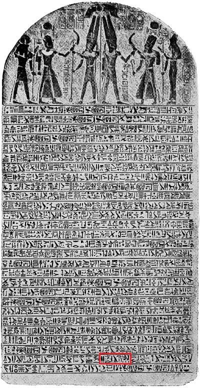 A Estela de Merneptá, 1207 a.C. O retângulo vermelho marca a palavra Israel — a menção mais antiga do nosso povo fora da Bíblia. Museu Egípcio, Cairo. Domínio público.