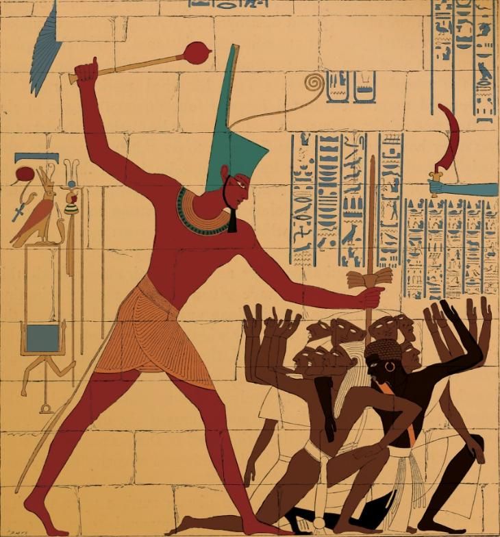O faraó com a mão direita erguida, esmagando seus inimigos. Essa imagem apareceu nas paredes dos templos por todo o Egito durante três mil anos. Não era apenas arte — era teologia. Ilustração baseada em um antigo relevo de templo egípcio.