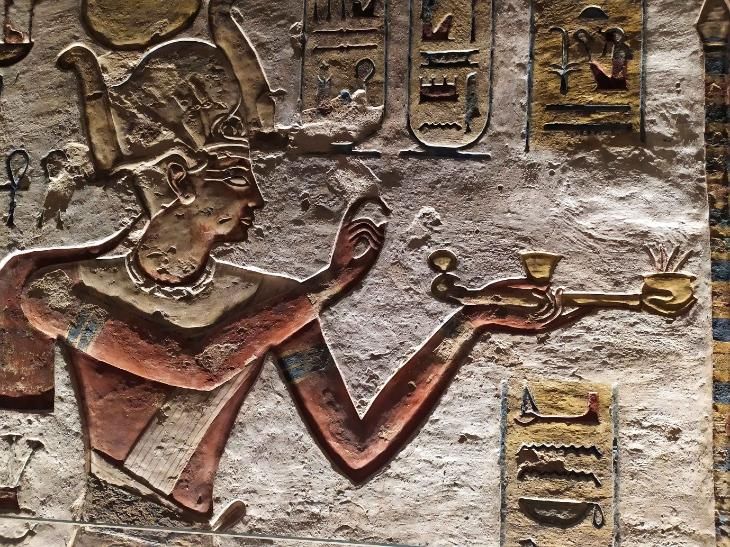 Um faraó oferecendo uma oferenda aos deuses, um relevo pintado na tumba KV11. Somente o faraó podia se aproximar do divino — mediador entre o céu e a terra. Vale dos Reis, Egito.