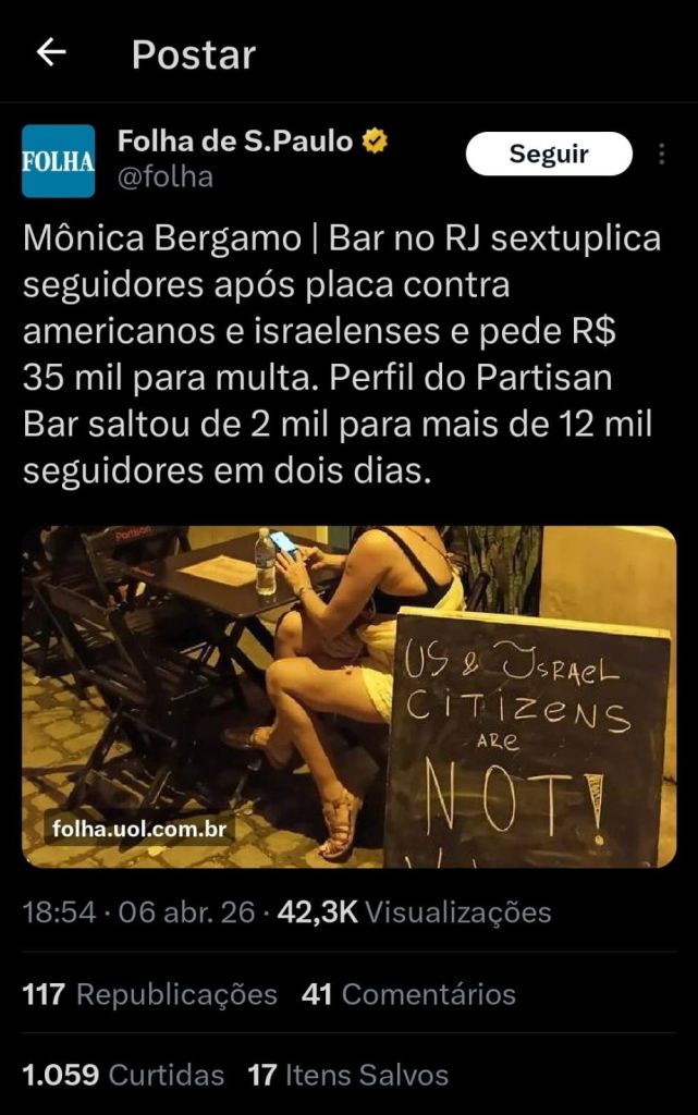 Nada voltará a ser como era antes. Tinha 2.000 pessoas no Instagram da birosca Partisan, agora são 12.000. deveria ser fácil para EUA e Israel colocarem estes nomes no banco de dados de recusa de visto.