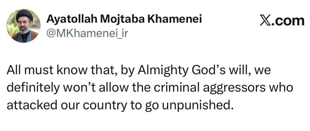 Poucos momentos antes do início do ataque, o líder supremo iraniano Mojtaba Khamenei escreveu no Twitter: “Todos devem saber que, pela vontade de Deus Todo-Poderoso, definitivamente não permitiremos que os agressores criminosos que atacaram nosso país fiquem impunes.”
