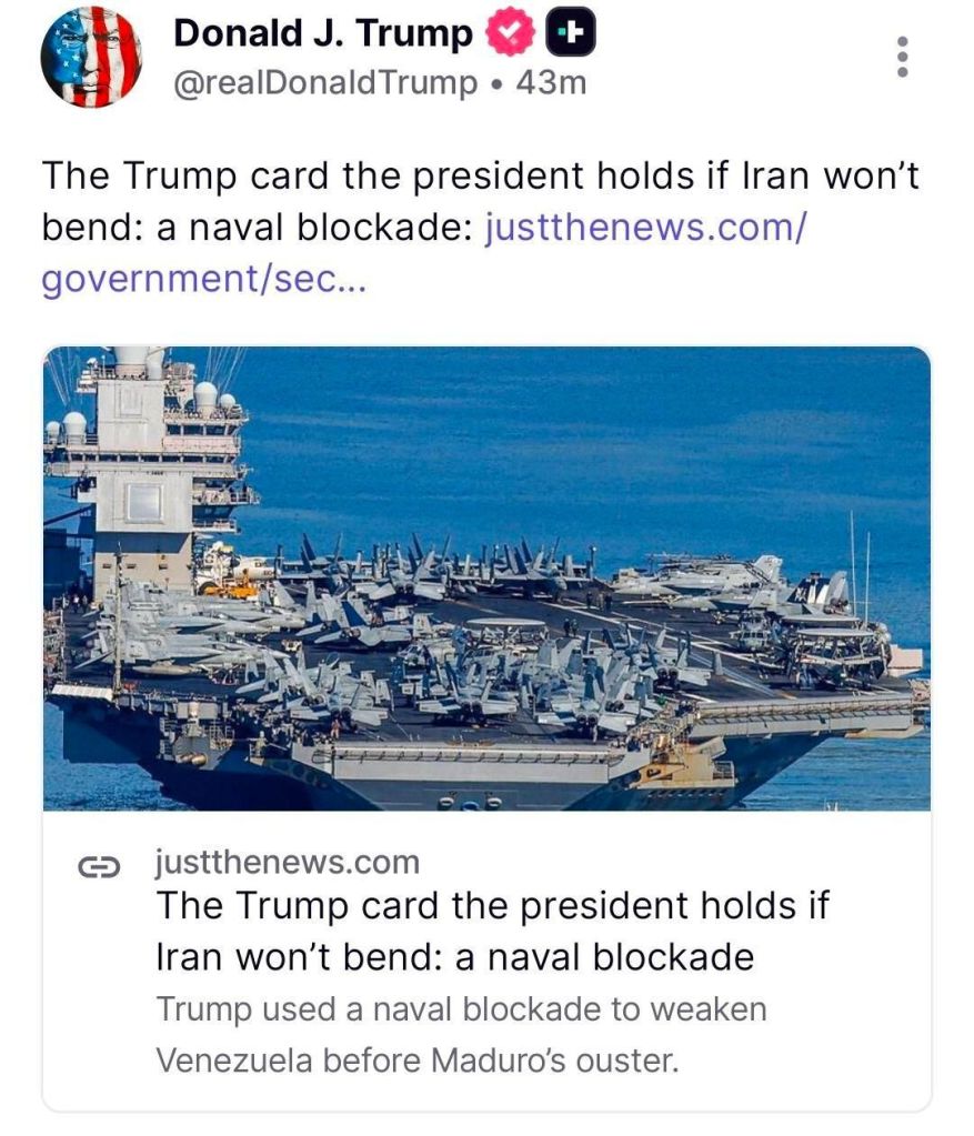 Por sua vez, Trump publicou em sua conta na Truth Social um artigo que discute a imposição de um *bloqueio naval ao Irã* — uma carta que ele já utilizou anteriormente para enfraquecer a Venezuela.