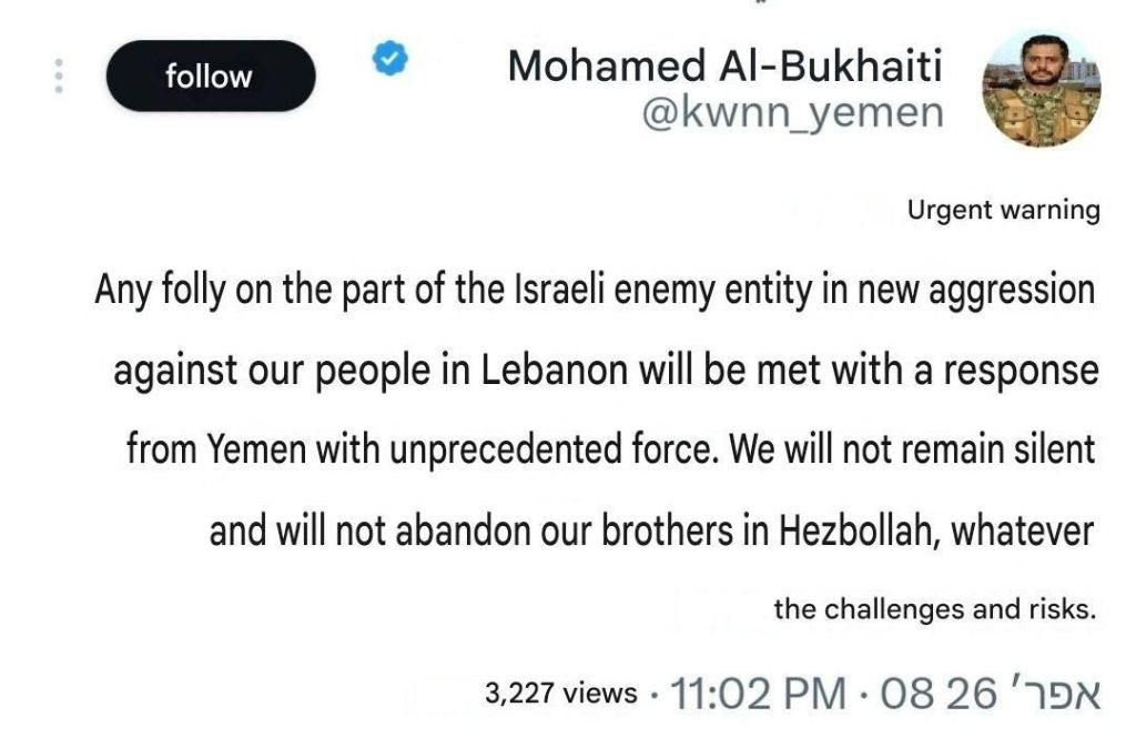 *Houthis se manifestam:* Os Houthis tuitaram hoje em hebraico para alertar que pretendem atacar Israel caso Israel não cesse os ataques contra o Hezbollah.