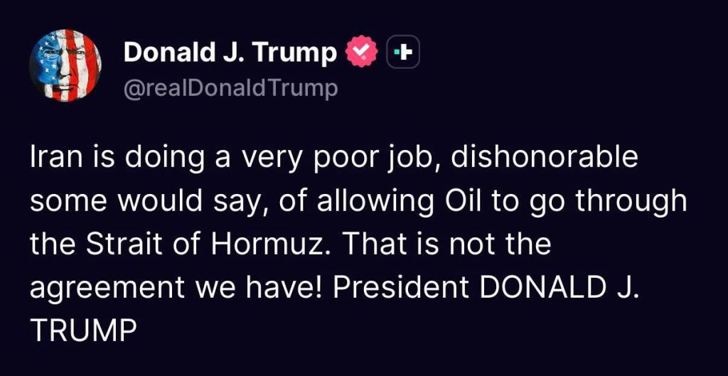*Trump ataca:* o Irã está fazendo um trabalho muito ruim — alguns diriam um trabalho vergonhoso — em relação à passagem de petróleo pelo Estreito de Hormuz. Este não é o acordo que temos.