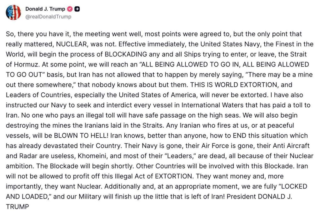 Então, aqui está: a reunião correu bem, a maioria dos pontos foi acordada, mas o único ponto que realmente importava, o NUCLEAR, não foi. Com efeito imediato, a Marinha dos Estados Unidos, a melhor do mundo, iniciará o processo de BLOQUEIO de todos e quaisquer navios que tentem entrar ou sair do Estreito de Ormuz. Em algum momento, chegaremos a uma base de “TODOS PODEM ENTRAR, TODOS PODEM SAIR”, mas o Irã não permitiu que isso acontecesse ao simplesmente dizer: “Pode haver uma mina por aí em algum lugar”, que ninguém sabe além deles. ISSO É EXTORSÃO GLOBAL, e líderes de países, especialmente os Estados Unidos da América, nunca serão extorquidos. Também instruí nossa Marinha a buscar e interceptar todas as embarcações em águas internacionais que tenham pago pedágio ao Irã. Ninguém que pague um pedágio ilegal terá passagem segura em alto-mar. Também começaremos a destruir as minas que os iranianos colocaram no Estreito. Qualquer iraniano que atire contra nós ou contra navios pacíficos será EXPLODIDO PARA O INFERNO! O Irã sabe melhor do que ninguém como ENCERRAR essa situação, que já devastou o país deles. Sua Marinha acabou, sua Força Aérea acabou, seus sistemas antiaéreos e radares são inúteis, Khomeini e a maioria de seus “líderes” estão mortos, tudo por causa de sua ambição nuclear. O bloqueio começará em breve. Outros países participarão desse bloqueio. O Irã não poderá lucrar com esse ato ilegal de EXTORSÃO. Eles querem dinheiro e, mais importante, querem armas nucleares. Além disso, no momento apropriado, estamos totalmente “PRONTOS E ARMADOS”, e nosso Exército terminará o pouco que resta do Irã!