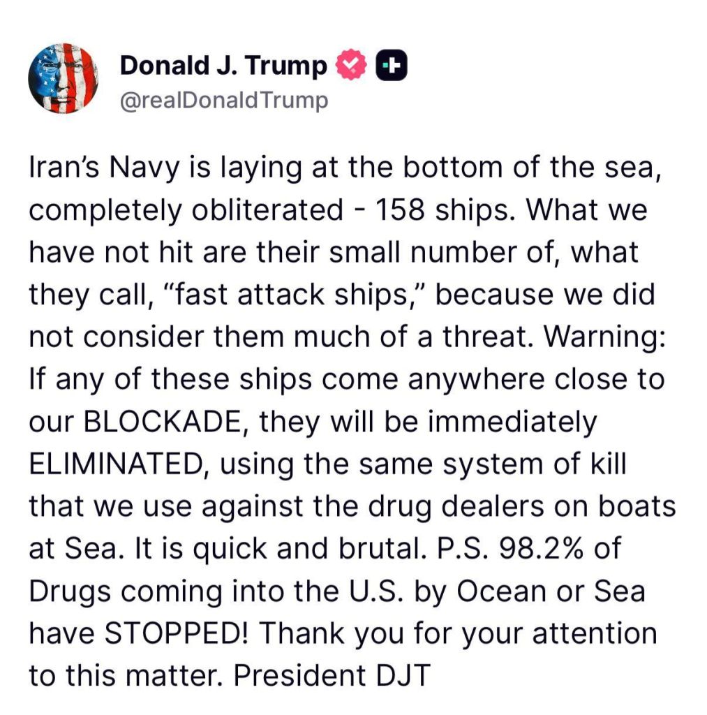 *Trump: Se qualquer navio iraniano se aproximar do nosso bloqueio, ele será destruído imediatamente.*