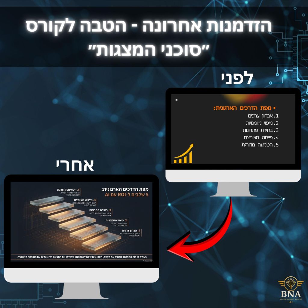 ✅ הסוף ל”עבודה השחורה” – הכלים שתלמדו יבנו עבורכם 90% מהמצגת (מבנה, תוכן ועיצוב ראשוני), כך שנשאר לכם רק לעשות את הפינישים ולהבריק.