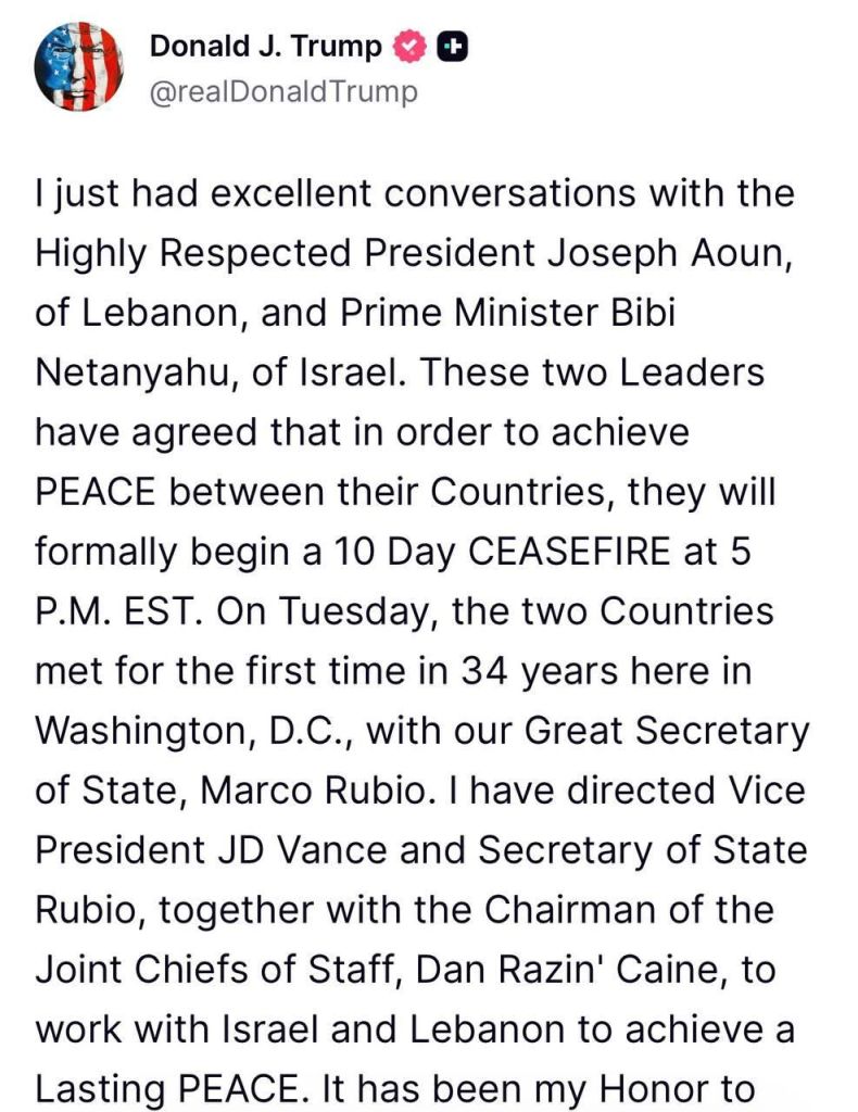 O presidente dos EUA, Donald Trump, informou o Líbano sobre um iminente cessar-fogo de 10 dias no país, com início à meia-noite.