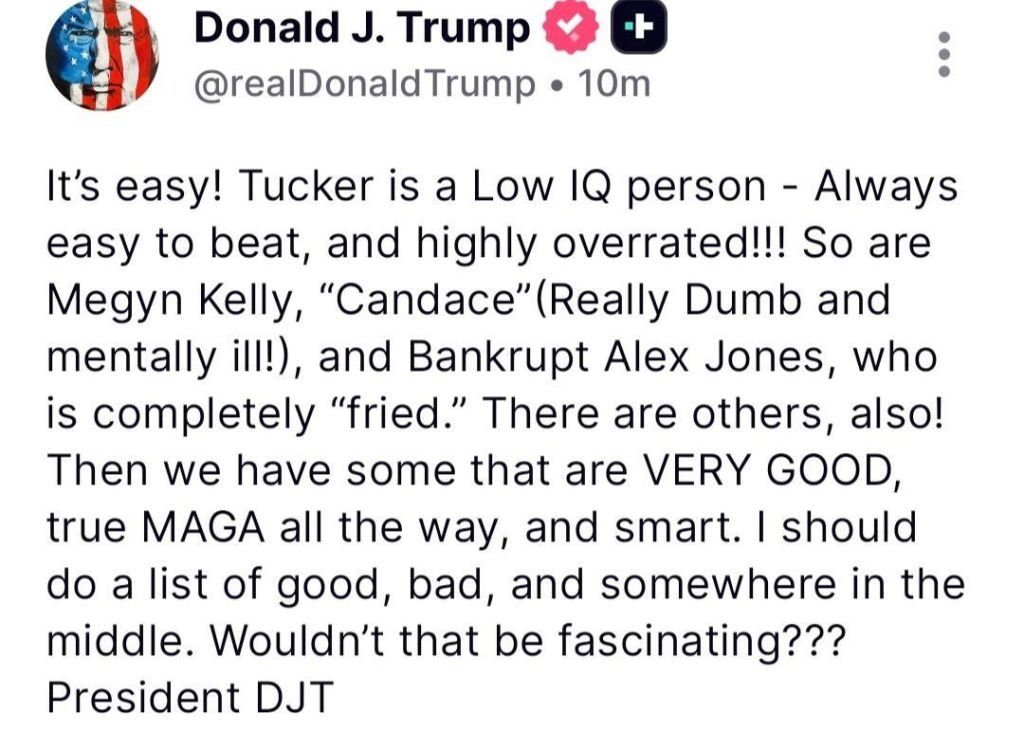 O presidente Trump publicou hoje no Truth Social contra várias figuras de veículos de mídia de direita dos EUA que se manifestaram contra Israel.