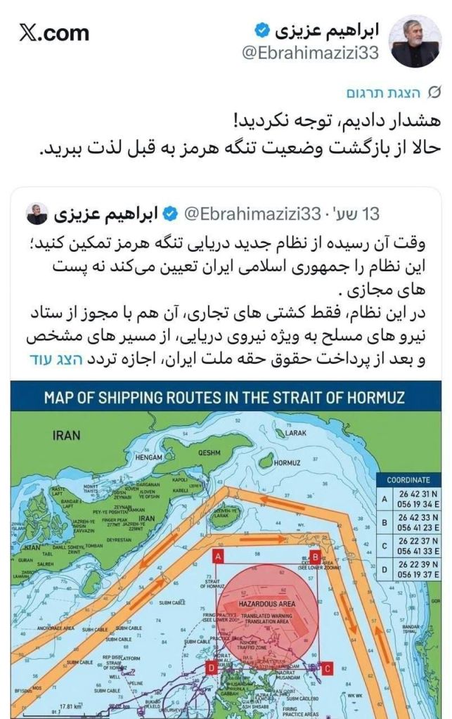 Sob essa ordem, apenas navios mercantes poderão passar — e mesmo assim com a aprovação do Comando das Forças Armadas, especialmente da Marinha — por rotas designadas e após o pagamento das taxas legais ao Irã.”