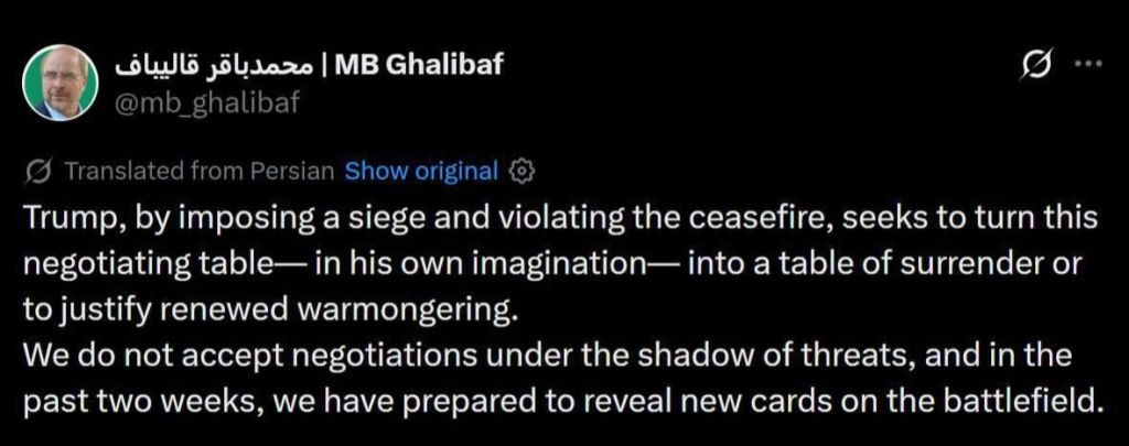 “Trump, ao impor um cerco e violar o cessar-fogo, busca transformar essa mesa de negociações — em sua própria imaginação — em uma mesa de rendição ou justificar uma retomada da guerra.
