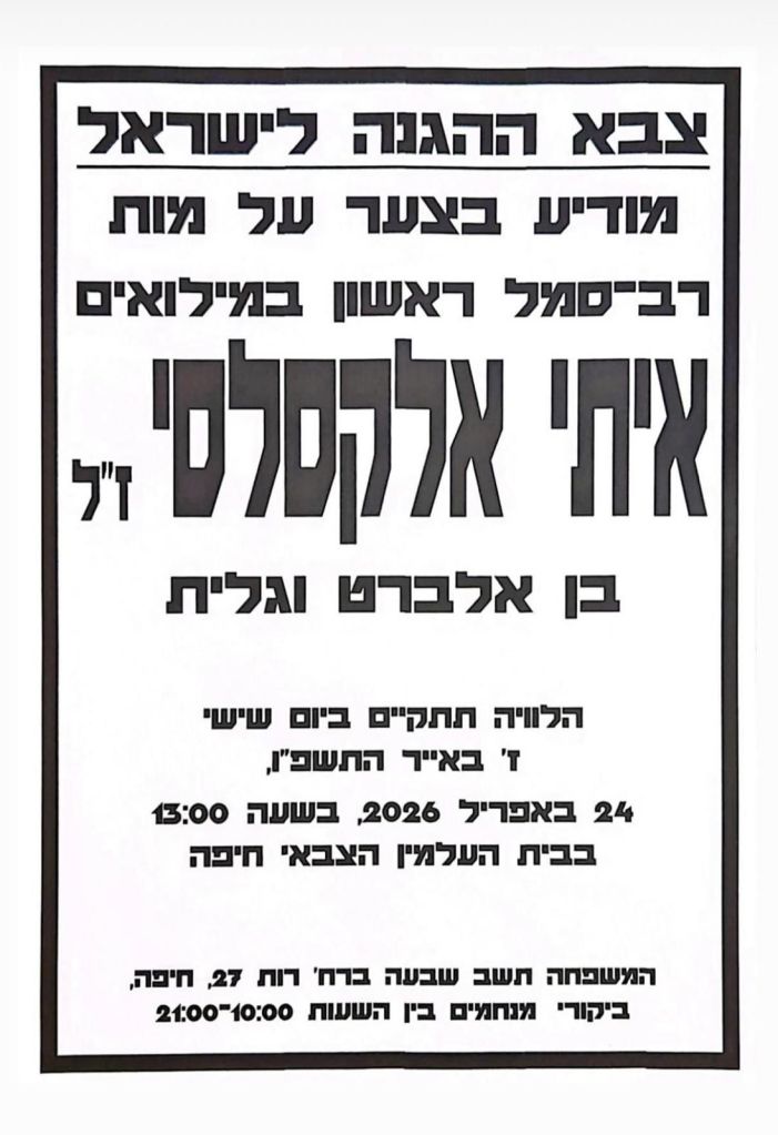 באורח טראגי: רב סמל ראשון *איתי אלקסלסי* ז״ל מחיפה, לוחם שלדג במילואים, אותר מחוסר הכרה בביתו. צוותי רפואה שהוזעקו למקום קבעו את מותו.