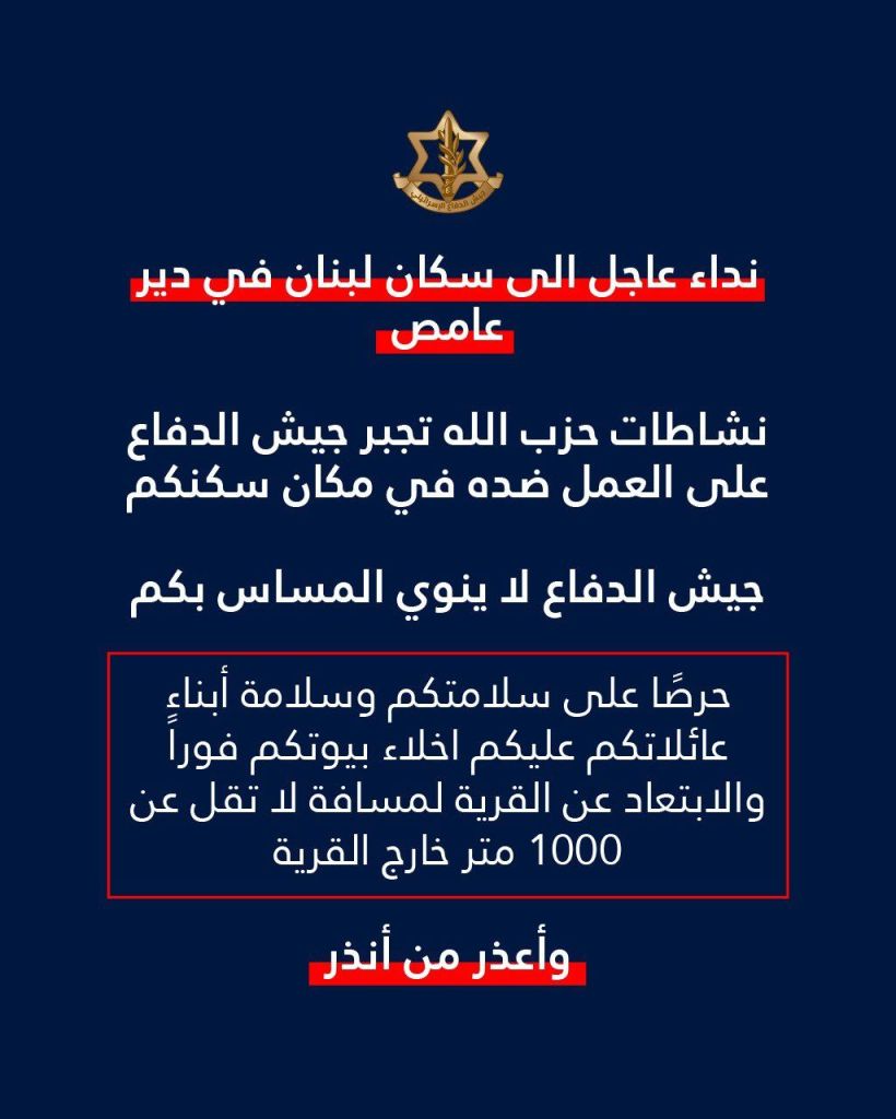 דחוף ‼️אזהרה דחופה לתושבי דיר עמאס, לבנון: