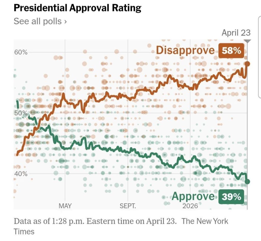 שיעור אי-ההתמיכה בטראמפ הגיע ל-58% – הרמה הגבוהה ביותר מאז שחזר למשרד הנשיאות.