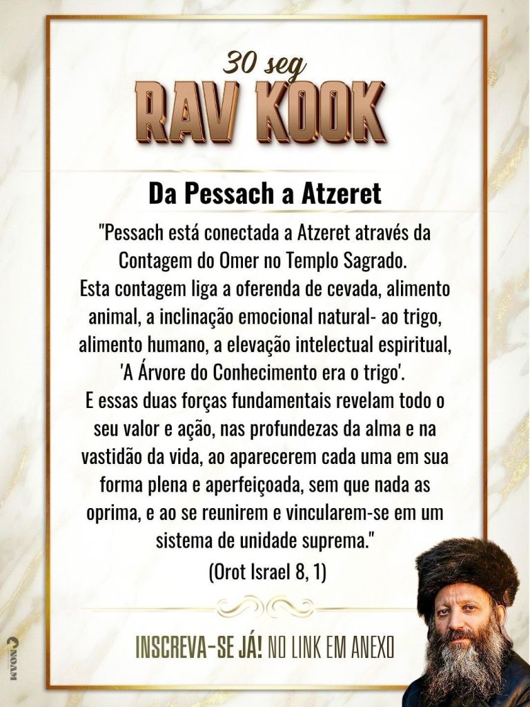 “מחובר הוא פסח לעצרת ע”י ספירת העומר שבבית המקדש, שהיא מחברת את מנחת השעורים, מאכל בהמה, נטית הרגש הטבעית, אל החטים, מאכל אדם, העלוי השכלי הרוחני, “עץ הדעת חטה היה”. ושני הכחות היסודיים האלה מגלים את כל מלא ערכם ופעולתם, במעמקי הנפש ומרחבי החיים, בהופיעם כל אחד בצורתו העצמית השלמה, באין שום דבר מעיק לו כלל, ובהתכנסם והתקשרם יחד למערכה אחדותית עליונה.”